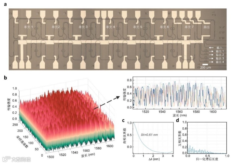 图2 (a)实验所用光谱仪芯片的显微镜图(b)所测得通道传输响应及用作示例的若干通道(c-d)通道响应的自相关系数和互相关系数