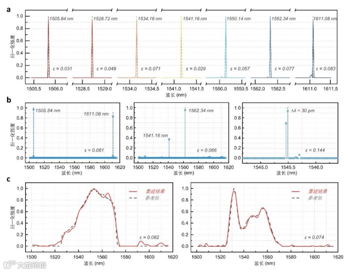 实验展示了此器件超过115纳米的工作带宽和小于30皮米超高分辨率。图3分别展示了其探测单峰、双峰窄带激光信号和宽带ASE光谱信号的测量结果,体现了较高的还原准确性。进一步仿真结果显示通过优化重构网络的采样通道数,器件可以实现个位皮米数的分辨率,达到甚至超过诸多台式光谱仪的性能标准。