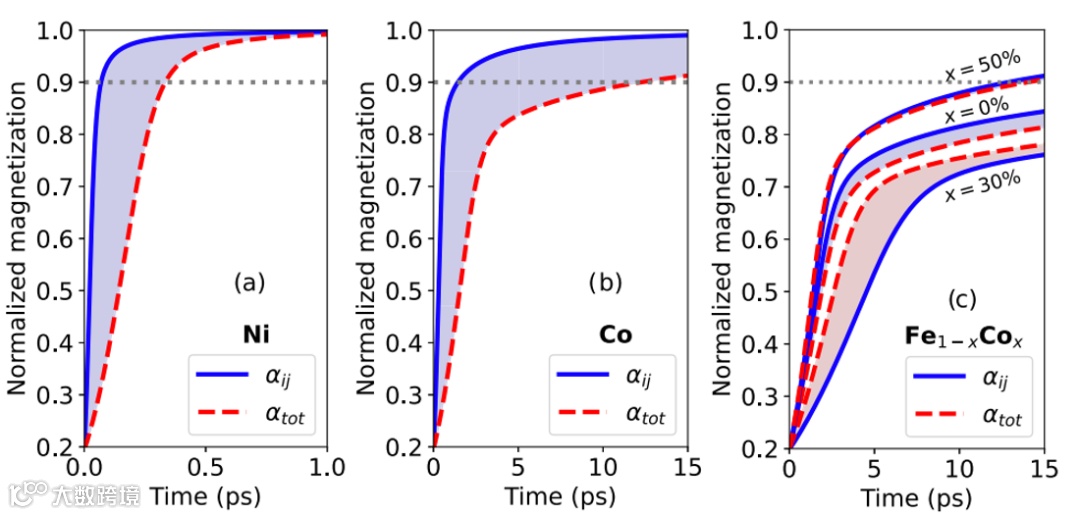 首先,图1给出了非局域阻尼对磁化过程的影响。在不同材料中,非局域阻尼对磁化过程有不同的影响,该工作研究的几个金属体系中,除了Fe70Co30的非局域阻尼会降低磁化速度外,其它磁性体系的非局域阻尼贡献会加快磁化速度。