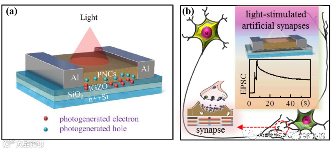 图:(a)钙钛矿/IGZO异质结型光电晶体管光驱动人工突触器件结构;(b) 钙钛矿/IGZO异质结型光电晶体管光驱动人工突触器件工作示意图