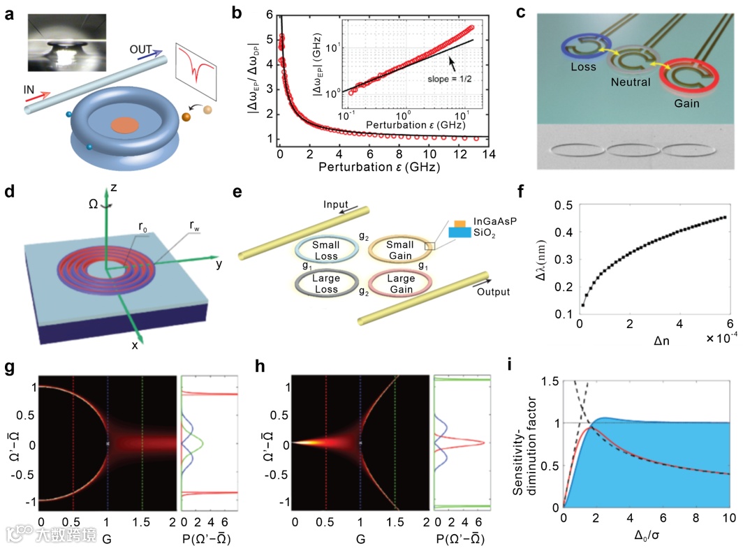 图3| 几种奇异点传感器的原理图以及由制备偏差引起的性能下降。a,参考文献60中基于回音壁模式谐振腔的用于纳米颗粒传感的奇异点传感器。首先将两个纳米尖端放置在腔体附近,以将系统调整至奇异点状态。当第三个粒子结合到空腔表面时,共振频率相应地分裂。b,频率分裂与微扰强度的实验测量。c,参考文献65中PT对称传感器的示意图和SEM图像。d,参考文献69中基于PT对称圆形布拉格激光器的纳米光子陀螺仪,即使在PT破缺区,旋转也会调制激光器的阈值增益。e,参考文献73中提出的由环形谐振腔和波导制成的四阶奇异点传感器。f,频率分裂与折射率变化的关系。当对其中一个谐振腔施加微扰(例如包层折射率的变化)时,频率分裂近似遵循四次方根响应。g,h,纳米级制造缺陷将影响频率分裂的可区分性,特别是在奇异点附近,如参考文献77中不同增益/阻尼的特征频率实部(g)和虚部(h)部分的分布所示。i,灵敏度降低因子图(实心曲线)。失谐参数