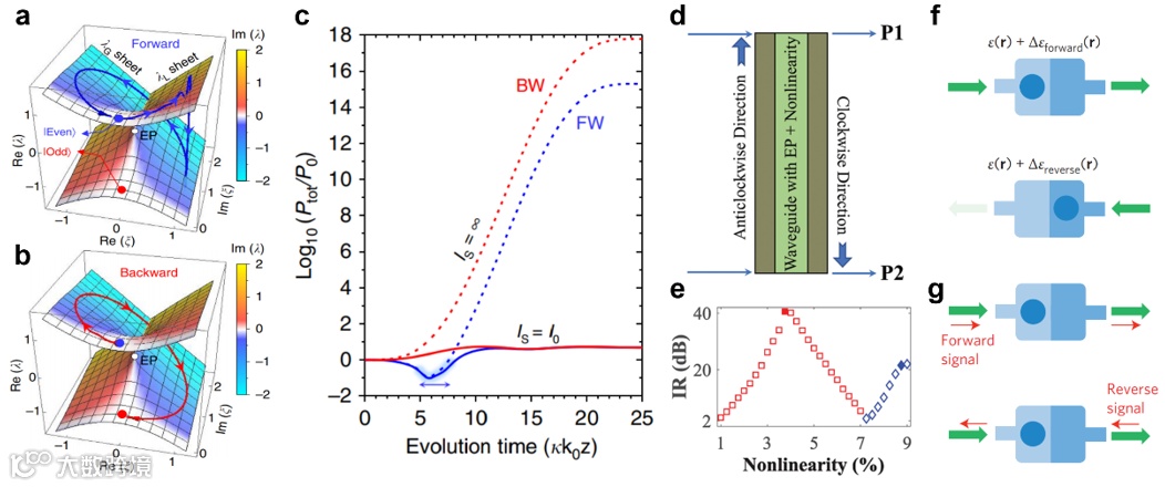 通过增益饱和非线性和非厄米性的结合,可以产生高效率的非互易性。以双波导系统为例。两个波导之间的耦合将导致两种耦合模式,即偶模和奇模。对于正向传输,偶模在环绕奇异点后恢复到自身(图5a),而对于反向传输,偶模在环绕奇异点后最终变成奇模(图5b),这意味着它们在两个方向上具有不同的功率比。然而,互易性要求模态传递(例如从偶向偶)在两个方向上保持相同。因此,正向和反向总传输功率应该是不同的(图5c中用虚线表示)。然而,当引入非线性增益饱和介质时,正向和反向传输的功率相同(图5c中用实线表示),因此互易性被打破。该方法得到的非互易效率只与非厄米系统中的非对称传输有关,而与波长无关。因此,在较宽的光谱范围内可以实现非互易性。