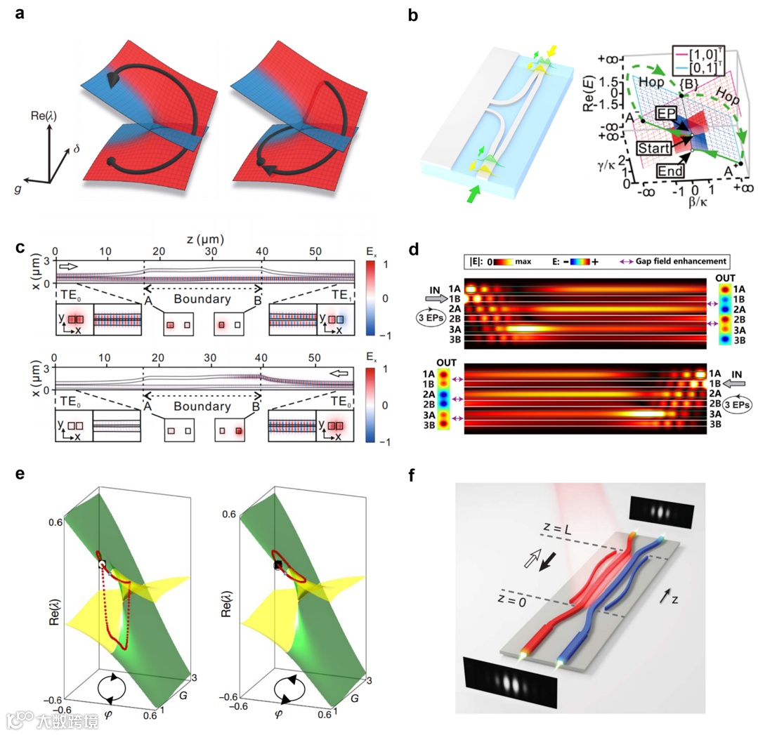 最近,研究人员证明,沿系统哈密顿量参数空间边界的快速参数演化可以放松对绝热性的严格要求。沿哈密顿参数空间边界的绝热参数演化显示出较小的本征态演化速率,其中两个本征态之一的能量耗散率极低。沿哈密顿参数空间边界快速包围奇异点使得非对称模式转换器具有紧凑的尺寸和接近一的传输效率(图4c)。在耦合波导系统中,反PT对称系统的优点是仅在一个波导中产生光能,这更有利于光学集成应用。通过进一步建立横电模式和横磁模式之间的耦合,实现了非对称偏振转换器件。此外,还特意设计了基于奇异点环绕的多模系统,以扩大通信容量。三模波导系统中的动态环绕奇异点可以从每一侧提供两种不同的输出模式。最近,研究表明,在多态非厄米系统中动态包围任意数量的奇异点,最终输出态为损耗最低黎曼面上的态(图4d)。