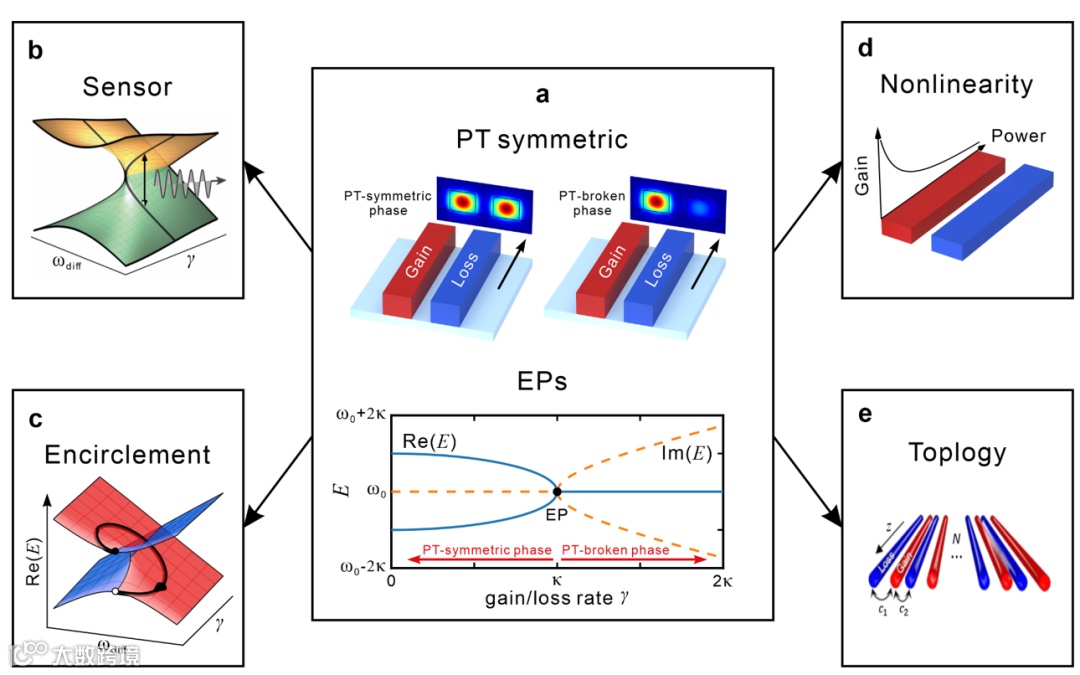 图1| 奇异点及其应用。a,耦合光学系统中的PT对称性。b,工作在奇异点附近的传感器。c,环绕奇异点实现非对称传输。d,奇异点在非线性光学中的应用。e,奇异点在拓扑光子学中的应用。