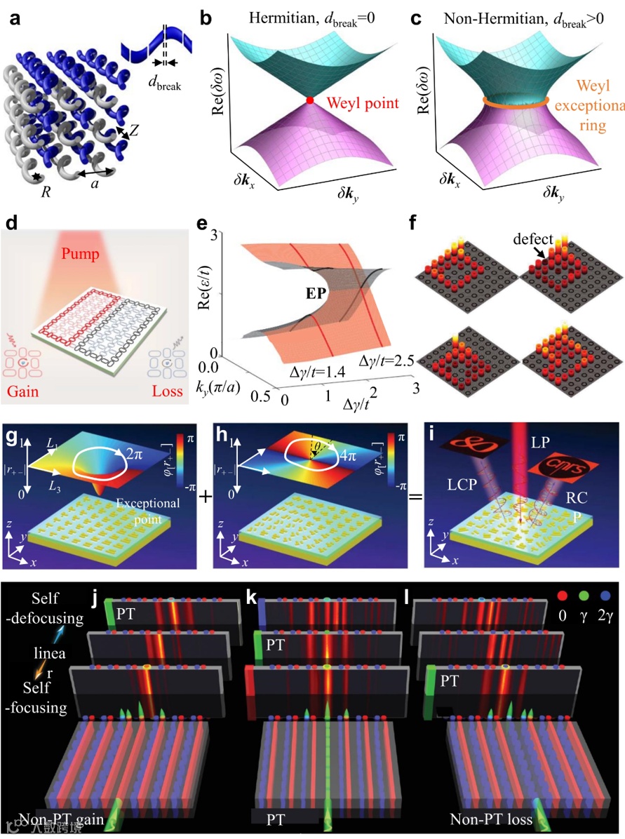 图6|非厄米物理在拓扑光子学和超构表面中的应用。a-c,三维Weyl光子晶体,以及支持原始Weyl点和Weyl奇异环的能带结构。d-f,非厄米因素控制的可重构拓扑光调控。增益区是通过外部光泵浦实现的,而损耗区是由于本征材料损耗(无光泵浦)造成的。g-i,具有奇异点的拓扑超构表面光相位控制工程。j-1,非厄米拓扑光子晶格中PT对称性和拓扑态的单通道非线性调控。