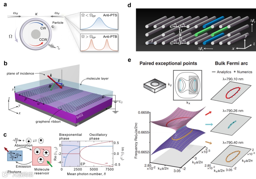 图2| 纳米光子系统中的PT对称性和奇异点。a,环形微谐振腔中的奇异点。这里的反PT对称性是通过角速度Ω的机械旋转引起的相反频移以及散射引起的耗散耦合κ实现的。b,石墨烯等离子振动模式耦合系统中的奇异点。通过改变光的入射角和石墨烯费米能级可以获得奇异点。c,光子气体微腔中的奇异点。通过用激光泵浦染料分子来补偿损失,光子和电子激发的染料分子之间的激发交换,光子气体耦合到该储层。d,耦合光波导阵列中的三阶奇异点。垂直于带的折射率梯度被用作外场。在这样的系统中,可以在存在折射率梯度的情况下实现非零三阶奇异点。e,由单个狄拉克点分裂的成对奇异点产生的体费米弧。