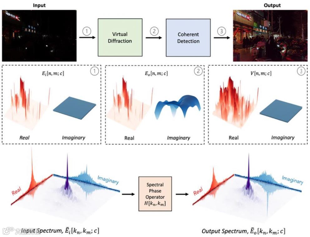 据此,Jalali院士提出了一种全新的图像增强范式,该范式将衍射和相干检测的物理过程作为算法的一部分,来执行计算成像任务,构成了一种图像增强工具。在研究中,研究团队将数字图像重新理解为空间变化的虚拟“光场”,然后将该场置于虚拟衍射和相干检测的物理过程中。在该过程中,光场被像素化和离散化,并且传播与频率相关的相位,并将数字图像的R-G-B三个通道理解为该虚拟光场的时频波段。最终由输出的相位,而不是强度来代表输出的图像,进行编码优化。研究团队将该算法命名为“基于虚拟衍射和相干探测的视觉增强算法(VEViD)”,其算法的物理解释和流程参见图2-图3: