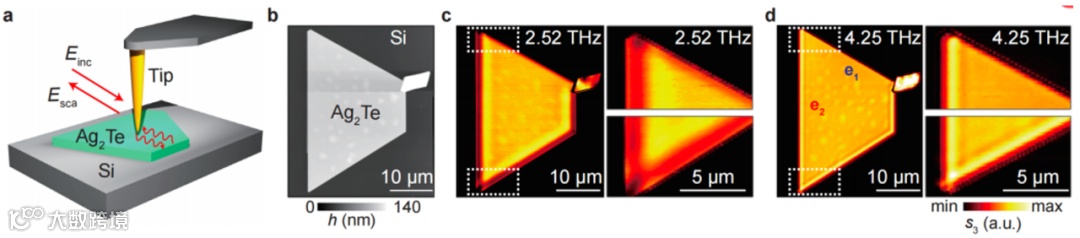 图2. 硅衬底上Ag₂Te薄片面内各向异性的太赫兹表面等离激元近场成像。(a) THz s-SNOM成像示意图。(b) 硅衬底上Ag₂Te薄片形貌图。(c) 频率为2.52 THz时近场成像图,左图代表整个薄片的近场成像图,右图是白色矩形区域的放大近场图。(d) 频率为4.25 THz时近场成像图,左图代表整个薄片的近场成像图,右图是白色矩形区域的放大近场图。