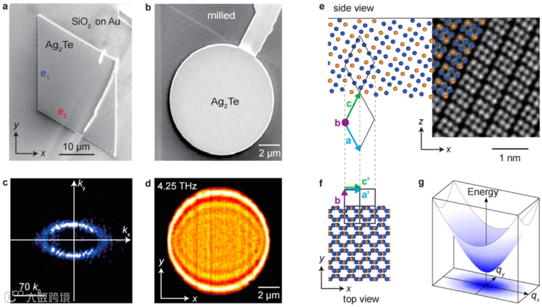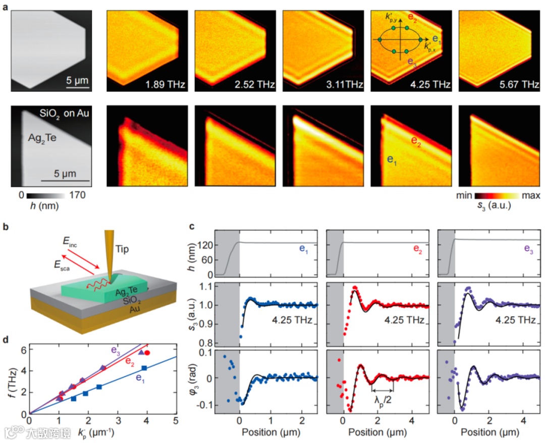 该团队利用团队前期发展的高性能THz s-SNOM(Shu Chen, et al, Nat. Commun. 2022,13,1374)对硅衬底上Ag₂Te薄片进行成像发现在Ag₂Te薄片不同边缘(如:e1,e2)附近可以观测到1个干涉亮纹,而且条纹到不同边缘的距离存在差异(图2),表明Ag₂Te支持面内各向异性的等离激元,这与面内定向电导测量结果呈现高度一致性。