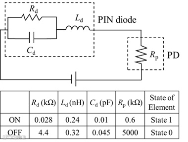 (1)新型光控微波开关:研究提出将光电二极管和开关二极管结合,其电路原理图如图1所示,利用光电二极管电阻的光敏特性,实现光控电阻变化,从而控制回路电流,避免了对大规模微波开关二极管阵列进行控制时,由于线宽和线距限制所导致的布线难度和复杂度,可实现对任意数量开关二极管状态的无线控制。