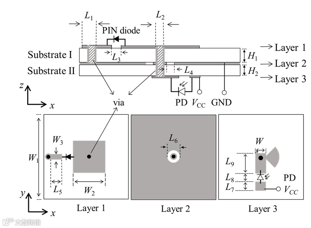 本文提出并验证了一种新型光控大规模无线可重构微带反射阵,利用激光代替导线传输控制信号,实现了大规模反射阵辐射方向图的可重构。研究中的关键设计分为三个部分: