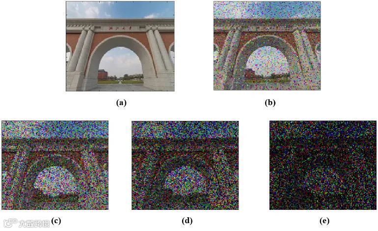 图2. 基于EMIT模型的图像传输。(a) 128*128像素的原始图像(无噪声)。(b) 多模优化传输(有噪声)。(c)-(e)分别使用模式1、模式2和模式3进行单模传输(有噪声)。