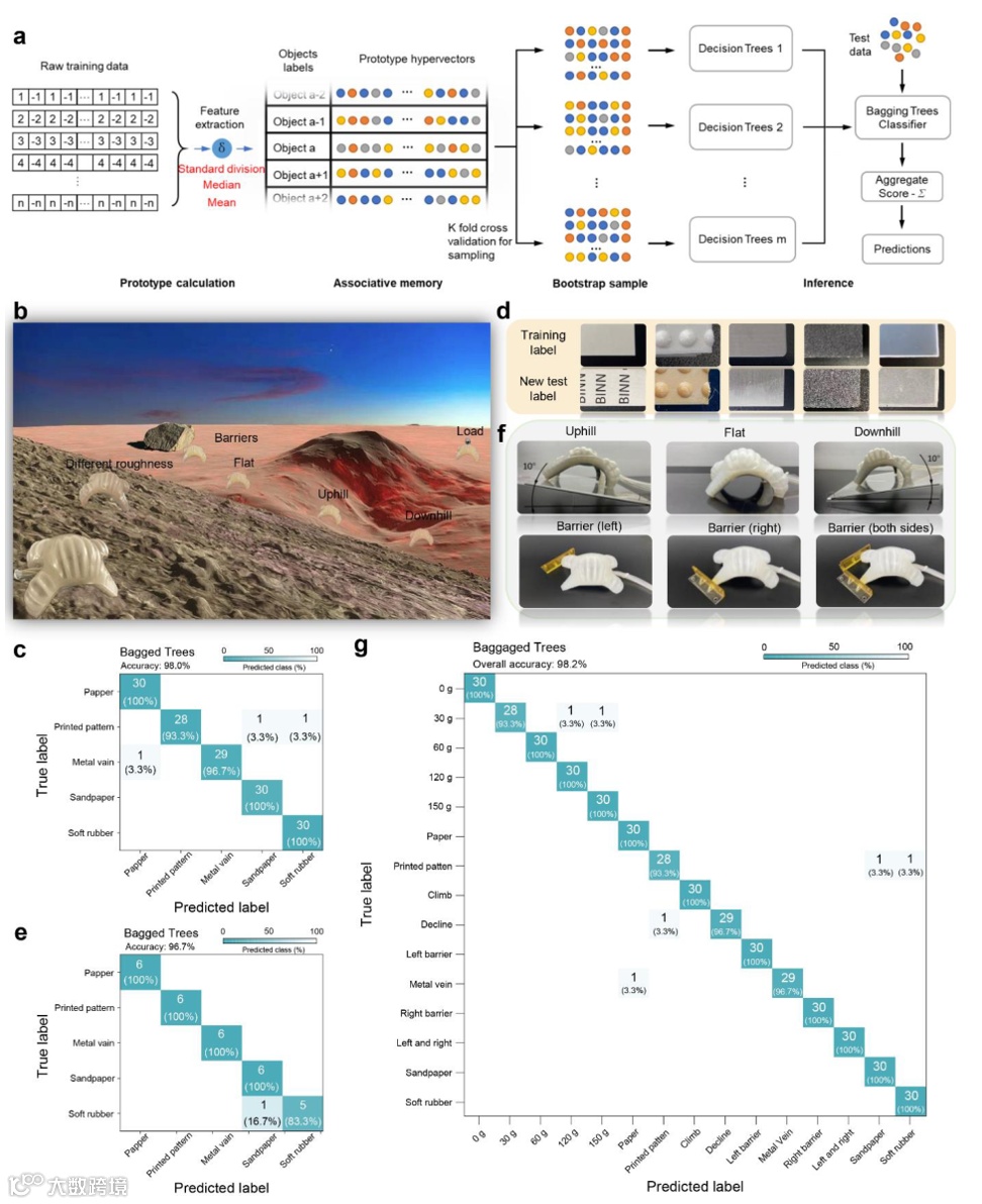 图4.集成 SSES 的软体爬行机器人的环境感知。a)机器学习过程的流程图。b)用于环境识别的软体机器人的概念图。c,d)实验场景的光学图像。e)具有五重交叉验证的地形表面训练(五种不同粗糙度的不同训练路面)。分类混淆矩阵,总体准确率为98.0%。白色文本值是正确预测的百分比,青色文本值是正确预测的百分比,颜色条表示预测比例的数量。f)识别五个未经训练的新地形,以证明所开发模型的泛化能力。新A4纸用墨水打印;新的印刷图案采用更小的浮雕和不同的材料印刷;新金属略微抛光;新砂纸粒度减小20%;新的软橡胶被灰尘污染。g)上述所有环境的混合识别,整体准确率为98.2%。