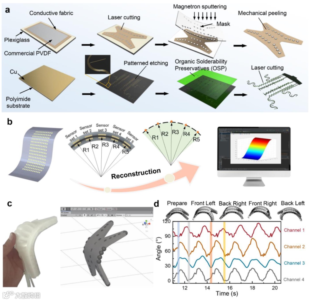 图2.SSES制造和形状重建。a) SSES 工艺流程图,依次为激光切割、磁控溅射和有机防焊剂 (OSP) 技术促进了 SSES 的批量制造,柔性印刷电路板提高了传感阵列互连的可靠性。b)基于传感器阵列的重建示意图。c)软体机器人弯曲的计算重建。d) 软体机器人典型爬行运动过程中四个传感块的实测角度曲线,突出显示不同的颜色以标记阶段。
