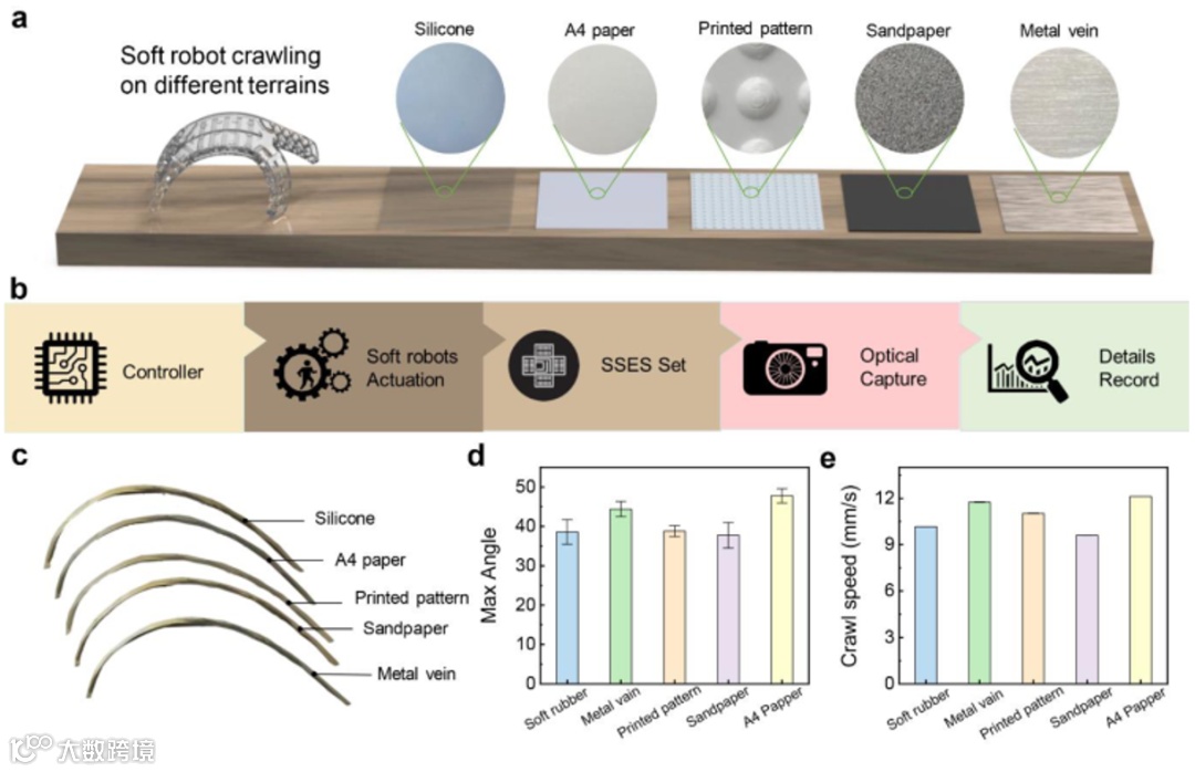 图3.软体机器人在各种地形表面爬行的动态移动行为分析。a)软体机器人在各种地形上爬行的示意图,放大图是不同地形表面的光学图像。b)基于SSES获取的数据验证感知周围环境可行性的流程图。c)软体机器人在各种地形上爬行时的底面轮廓。d)SSES在10次试验中测量的机器人左前脚点的平均最大弯曲角度,误差条表示平均值的标准误差。e)软体机器人爬过不同地形时的平均爬行速度。