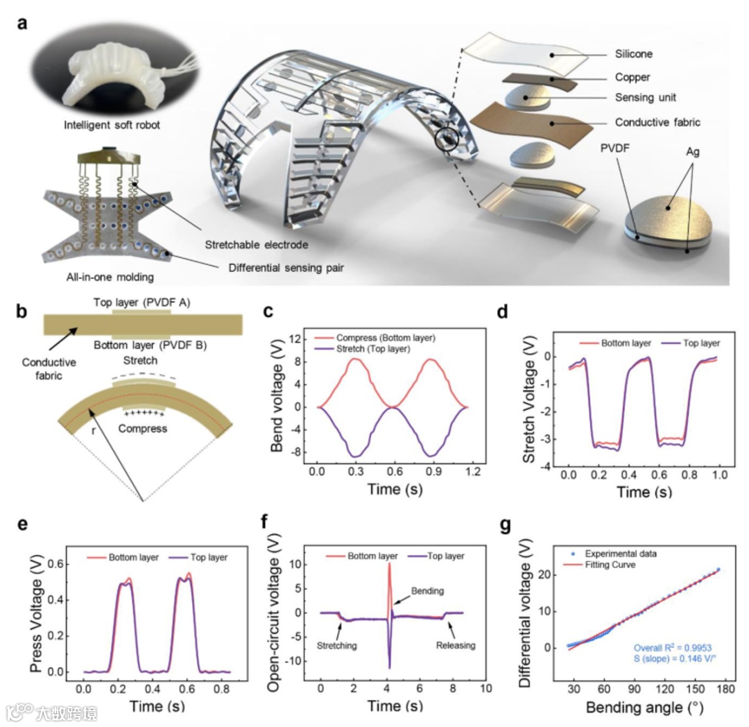 研究提出了一种基于差分压电矩阵的形状感应电子皮肤(SSES),它可以通过集成机器学习技术来使得软体机器人具有本体感知和外部感知能力。SSES的每个构建块都是由两个聚偏二氟乙烯(PVDF)膜中间夹杂导电织物构成的。当施加压力或拉伸时,这两个PVDF膜的输出是相同的。因此,可以使用差分策略识别和最小化这些干扰,从而保证弯曲感知的鲁棒性,如图1所示。
