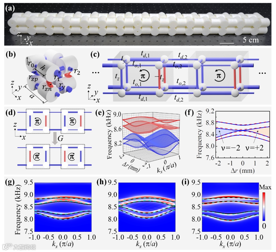 的一维声学拓扑绝缘体样品图。样品单胞结构的示意图如图2 (b) 所示,其中红色连接管代表两个声学谐振腔之间为负耦合,蓝色连接段代表两个声学谐振腔为正耦合。通过正、负耦合的引入,该团队在声学晶体中设计出等效的Z2规范场,进而实现系统空间反演对称性的投影表示。图2 (c) 和图2 (d) 分别为系统紧束缚模型的结构示意图以及规范变换的过程示意图。可以看到规范变换只改变z方向的耦合系数的符号,其他方向的耦合保持不变。图2 (e) 与图2 (f) 分别为仿真计算的声学拓扑绝缘体的能带相图以及其带隙和拓扑不变量随着几何参数的演化图。图2 (g)至图2 (i)分别展示了不同