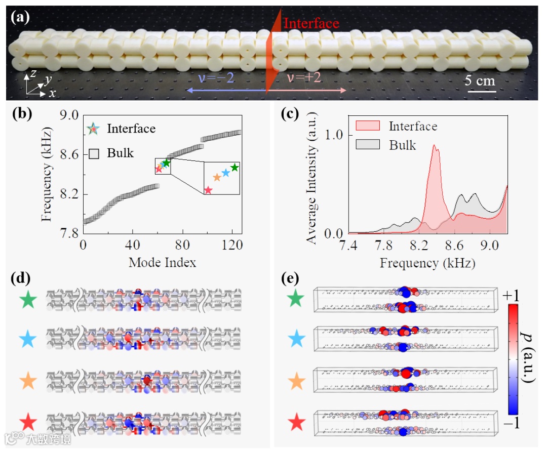 图4 两个具有自旋拓扑相以及相反拓扑不变量(绕数)的拓扑声学绝缘体构成的界面态。 (a)两个一维声学拓扑绝缘体构成的界面(红色平面)的样品图。(b)样品本征频率的仿真计算结果。(c)界面区域(红色)与体区域(灰色)的平均能量密度实验测量谱。(d)、(e) 拓扑界面态声压分布仿真计算和实验测量结果。