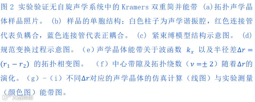 对应的声学晶体的仿真计算(线图)与测量(颜色图)的能带。可以看到能带经历了从打开到关闭再到重新打开的过程,而且伴随着拓扑相变声学晶体的绕数