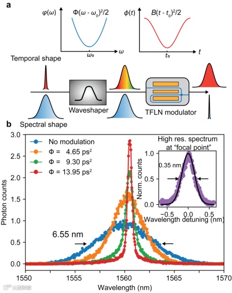 图五:同样的集成电光调制器可以实现时间透镜从而压缩单光子带宽
