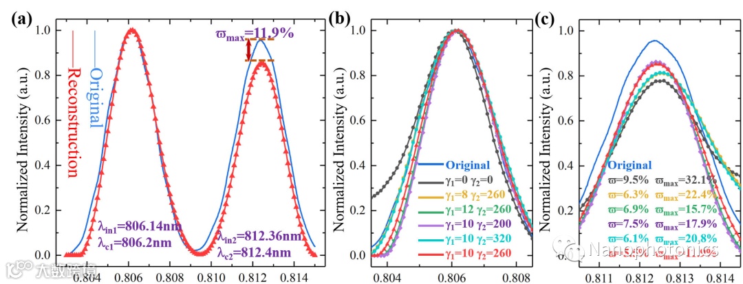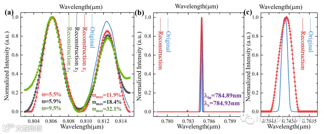 进一步,研究人员在12nm的工作带宽、光谱范围803nm~815nm下,利用最小范数的凸优化算法,对典型的未知光谱信号进行重构检测。分别对中心波长为806.08nm(如图3(a)所示)及808.06nm(如图3(c)所示)的单宽带光谱信号进行重构,其中3(b),(d)为其对应传输矩阵。随后,对双宽带光谱信号进行重构验证(如图4(a)所示),并通过重构光谱与原始光谱的误差结果,验证了优化算法中最优参数设置问题(如图4(b)、(c)所示)。团队还将不同的凸优化算法对同一未知光谱信号的重构结果进行了比较,结果显示研究中所采用的基于最小范数方案的凸优化算法具有最佳的重构精度,误差相对最小(如图5(a)所示)。最后,为了验证系统分辨率,中心波长为784.89nm,半高宽FWHM=0.17nm的激光器信号作为入射信号进行实验验证,重构误差~0.04nm。研究表明,提出的片上微环谐振器阵列光谱检测系统可以实现多个典型光谱的重构,系统工作带宽12nm,分辨率优于0.17nm。