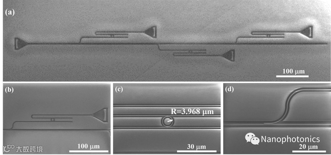 图2 扫描电子显微图像。(a) 系统微环谐振器阵列。(b) 微环谐振器单元。(c) R=3.968μm的微环形谐振器。(d) 定向耦合器