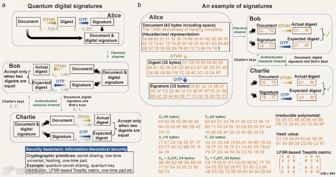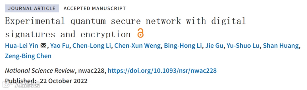 近期,南京大学物理学院、固体微结构物理国家重点实验室、人工微结构科学与技术协同创新中心陈增兵-尹华磊课题组联合矩阵时光数字科技有限公司在量子安全技术方面取得重要突破,首次基于非对称量子密码在超过100公里距离下成功实现不可否认地传输兆比特图像。该课题组创造性地提出“一次一哈希”,结合秘密共享的密钥非对称特性和“一次一密”的加密原理构造了可商用化的量子数字签名框架。以签名一份兆比特的文件为例,该框架将签名速率提升数亿倍。该实用化量子数字签名协议只需消耗数百比特的非对称量子密钥即可实现对几乎任意长的文件进行信息论安全的数字签名,从而确保文件传输的真实性、完整性和不可否认性。与此同时,该量子数字签名框架兼容各种量子秘密共享和量子密钥分发协议。基于此,该团队在实验上演示了全球首个全功能量子安全网络,实现了信息安全的全要素——机密性、真实性、完整性和不可抵赖性——保护,为数字经济、数字货币等提供了技术完备的量子安全底座。相关研究成果以“Experimental quantum secure network with digital signatures and encryption”为题在线发表在《国家科学评论》[DOI: 10.1093/nsr/nwac228, 2022]上。