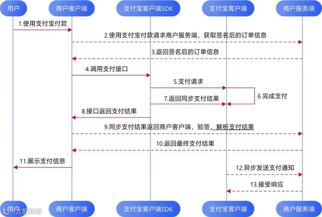 密码学可以保护信息安全的四个基本要素:机密性、真实性、完整性和不可抵赖性。加密和数字签名是现代密码学的两大支柱,其中加密保证了消息传输的机密性;数字签名确保了消息传输的真实性、完整性和不可抵赖性。因此,加密和数字签名是当前互联网的安全基石,支撑着每年数以万亿美元的数字经济保持安全而有效的运行。其中,数字签名广泛地应用于电子商务、支付、电子邮件和网页浏览等同普通大众息息相关的生活中。以电子商务为例,每年的双十一都是中国电子商务行业的年度盛事,上亿级的用户通过淘宝、京东、拼多多等商城进行消费。只有保证每一笔交易中的订单信息、支付记录的真实性、完整性和不可抵赖性,用户和商家才能放心进行电子商务活动。如何确保源源不断产生的订单的安全性呢?支付宝的支付流程采用了基于公钥加密体系的数字签名算法来保证安全,如图1所示。使用支付宝进行交易时总共包括三个参与方:用户、商户和支付宝,其中商户和支付宝各自生成一对公私钥,商户端公私钥用于对支付订单进行签名、验签,支付宝公私钥用于对支付信息进行签名和验签。随着量子计算时代的来临,以公钥密码为基础的加密和数字签名在量子计算攻击下是不安全的,存在着巨大的安全隐患。
