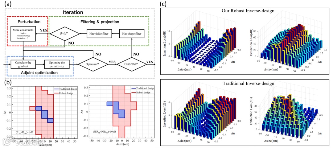 图1. (a)“鲁棒-逆向”设计算法流程图;(b)”鲁棒-逆向”设计算法(红色区域)和逆向设计算法(蓝色区域)的鲁棒性分析对比图;(c)不同加工误差下鲁棒-逆向设计算法和逆向设计算法的器件性能对比。
