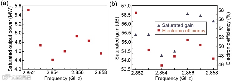 图3 超构材料速调管的测试结果。(a)饱和输出功率与频率的关系;(b)饱和增益和电子效率与频率的关系。