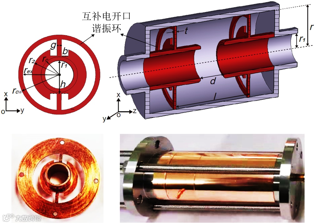 图1 全金属互补电开口谐振环及对应的超构材料谐振腔模型及样件。