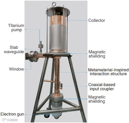 电子科技大学和合作单位特别是昆山国力电子科技股份有限公司,利用一种全金属超构材料单元—互补电开口谐振环,首次实现了S波段MW量级的超构材料速调管。这种超构材料单元具有的亚波长特性,使超构材料速调管突破了传统速调管由于尺寸共渡的限制;而超构材料单元特有的强谐振性质有利于速调管的大功率、高效率和高增益。加载互补电开口谐振环的互作用结构具有小型化的特点,其体积仅约为传统结构的0.44。对基于该互作用结构的超构材料速调管进行了理论分析、优化设计、以及加工装配。在热测实验中,采用120kV/80A的圆形电子注,在2.852GHz处观测到最大的脉冲输出功率为5.51MW,增益为55.6dB,电子效率为57.4%,较同类传统速调管的电子效率提升了近10%。