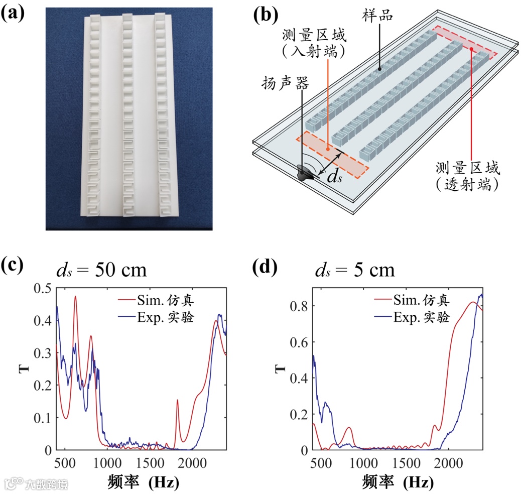 图4 实验验证。(a) 3D打印的样品照片;(b) 二维平行平板声场测量系统示意图;(c) 远场入射实验与仿真透射谱;(d)近场入射实验与仿真透射谱