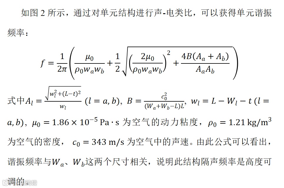 接下来,通过COMSOL Multiphysics的“压力声学”与“热黏性声学” 模块进行多物理场仿真,验证理论模型中的谐振公式的正确性,结果如图3所示,理论解与仿真解拟合较好,说明利用单元谐振频率公式可以根据需求隔声频率来有效设计单元尺寸。另外,20个单元组成的隔声阵列仿真效果如图3(b)所示,其在880 ~ 1915 Hz(超过一个倍频程)的宽频范围内具备大于17 dB的隔声量,说明通过串联各个谐振隔声单元可以有效拓宽隔声频率带宽。