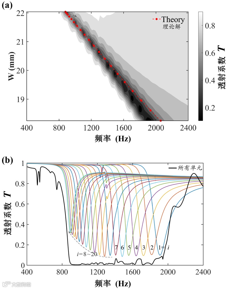 图3 透射谱图。(a)透射系数与与宽度尺寸和频率的关系;(b)阵列透射谱与20个单元各自的透射谱。