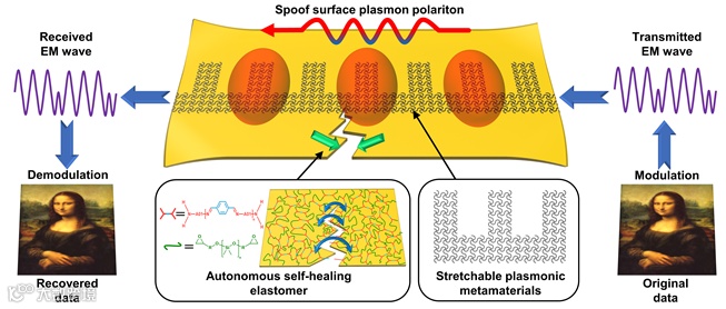 图1. 自修复柔性可拉伸人工表面等离激元波导示意图。