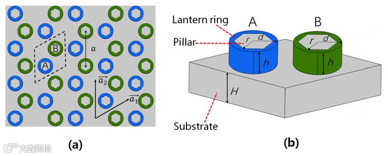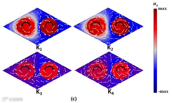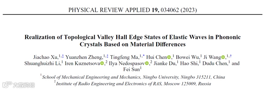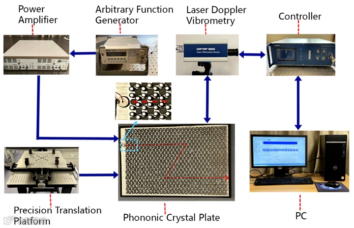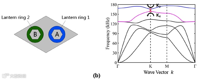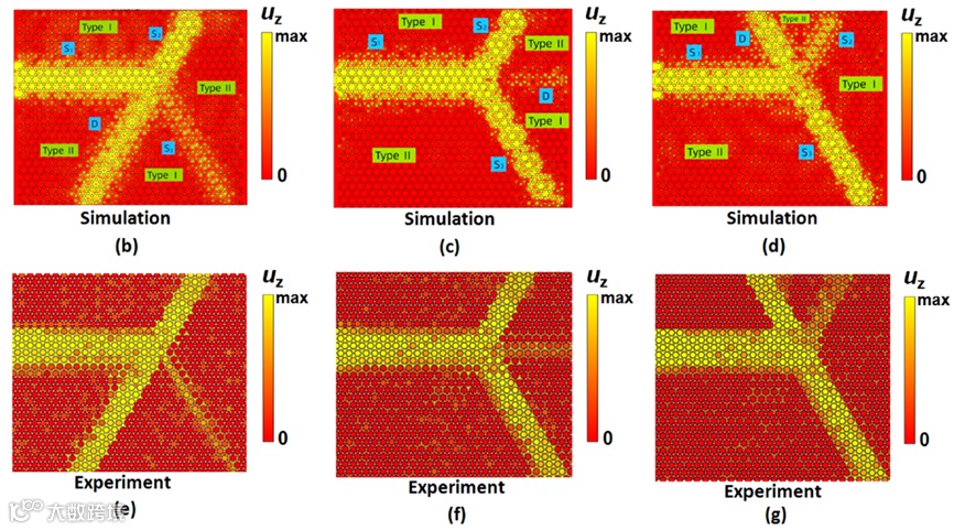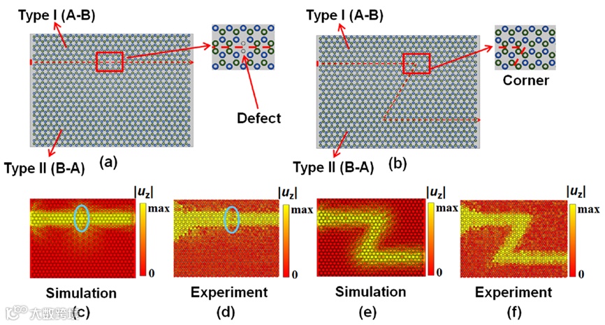 图6. 受拓扑保护的波导(套环材料:铜合金(A),碳钢(B)): (a) 带缺陷的直线波导设置,(b) Z字形波导设置,(c)、(d)带缺陷直线波导的仿真和实验结果,(e)、(f) Z字形波导的仿真和实验结果
