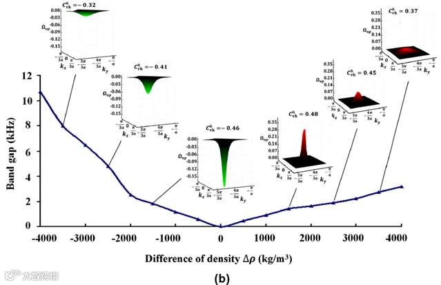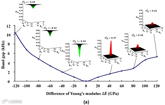 图4 材料参数连续变化时贝利曲率、谷陈数和带隙的演化过程:(a)杨氏模量, (b)密度