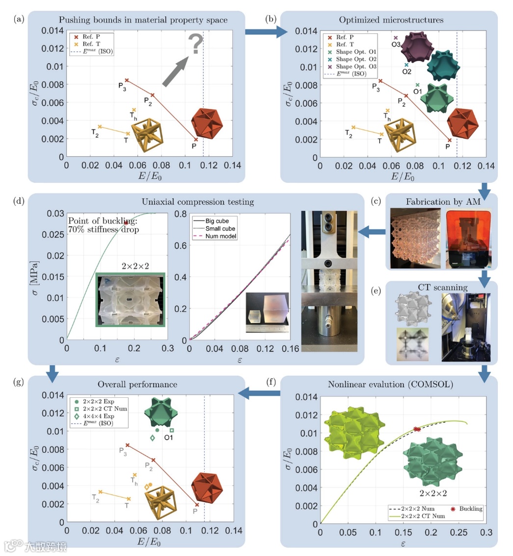 近日,丹麦技术大学Fengwen Wang和Ole Sigmund团队系统地设计、构建和测试了空心桁架点阵微结构,分别将其单尺度非层级(一阶)微结构、一阶和二阶平板微结构的屈曲强度提高了2.4倍、5倍和1.4倍。微结构的刚度在理论范围的40%以内,同时优于桁架和二阶板微结构。将材料设计过程与3D打印约束相结合,开发具有极端刚度和屈曲强度的可制造各向同性微结构构型,并进一步通过实验验证其性能。还通过CT扫描样品的数值建模提供了额外的见解。相关研究发表在《Advanced Functional Materials》上。(徐锐)