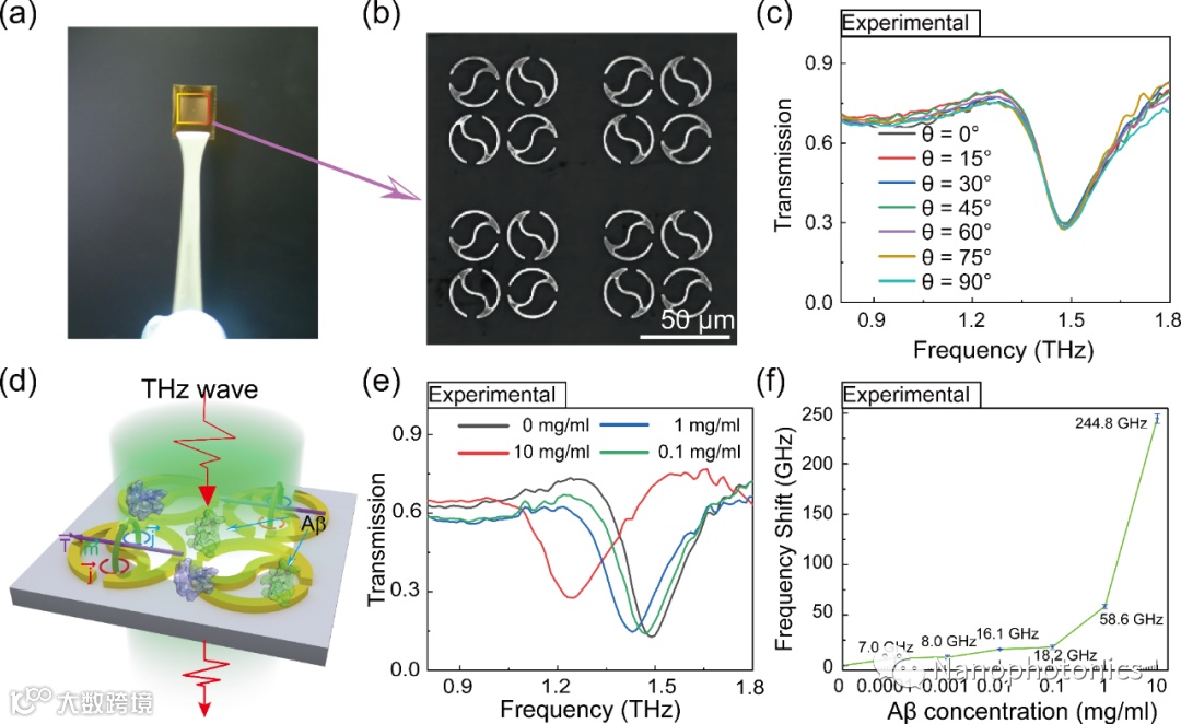 (2)QTR太赫兹超材料传感器可应用于Aβ蛋白浓度从0.0001 mg/ml到10 mg/ml的大范围定量检测。如图3所示,实验制备并验证了QTR超材料在太赫兹频段上的共振现象以及与入射光偏振方向无关的特性。QTR超材料与太赫兹时域光谱系统(THz-TDS)有机结合实现了对不同浓度的单体Aβ的无标记定量检测。其检测的范围和灵敏度丝毫不逊色于传统的比色法、电化学法和荧光检测法。