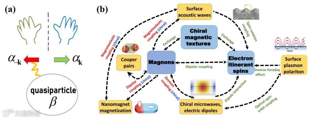 图3. (a) 准粒子手性相互作用。(b) 手性相互作用和近场自旋电子学的众多载体及其相互作用。