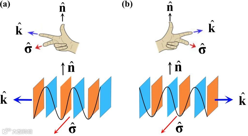 图1. 手性及手性平面波的定义。(a)和(b)分别定义了右手手性波和左手手性波,其中左右手张开拇指、食指和中指构成的对象互为镜像。其中,