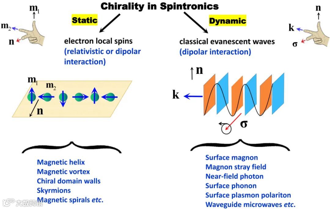 图2. 自旋物理领域的手性分为静态的结构手性与动态的准粒子手性两大类。左边为通常情况下,局域电子由自旋-轨道耦合或偶极相互作用所导致的静态手性磁结构。右边为众多准粒子所涌现的动态手性。