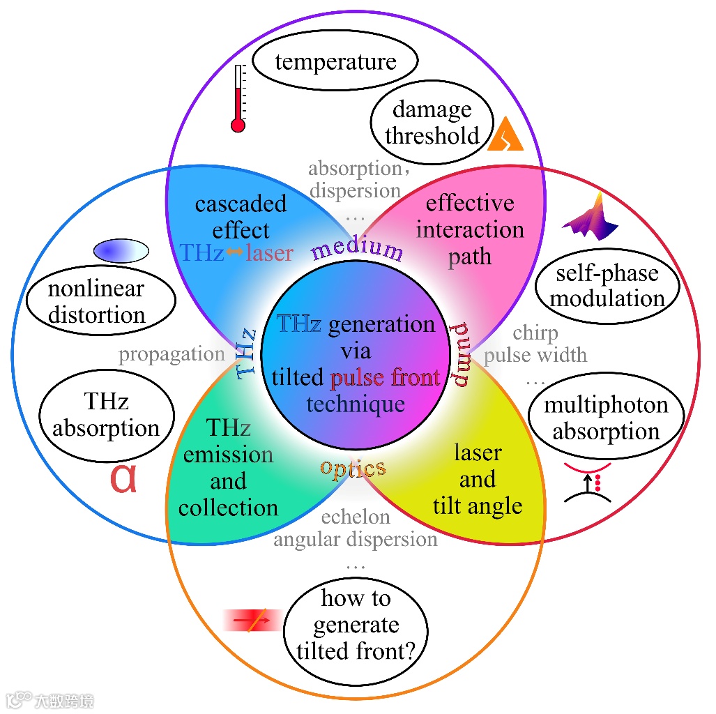 近年来,不仅铌酸锂THz强源实验技术得到了快速发展,在理论方面也有非常重要的进步。采用铌酸锂倾斜波前技术产生THz的过程需要考虑到两个不同频段的波(THz波和泵浦激光)之间的相互作用以及各种线性和非线性过程,理论和模型都很复杂。倾斜波前理论经历了四代模型的演变。第一代的简单1D模型用于预测THz产生波形,第二代基于线型源解析解与卷积可得到2D的THz脉冲波形。第三代则聚焦在对波函数的严格解从而得到更准确的THz波形和能量。第四代基于传播方向上的缓变包络近似并考虑级联效应等重要物理过程,使得理论预测可以更准确地解释实验现象。飞秒激光泵浦铌酸锂晶体产生强场THz辐射的物理机理十分复杂,影响THz产生效率主要有六大因素,如图3所示。