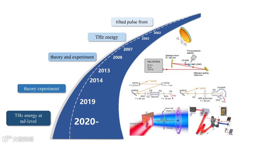 图2 基于铌酸锂倾斜波前技术产生强场THz脉冲的阶段性发展示意图