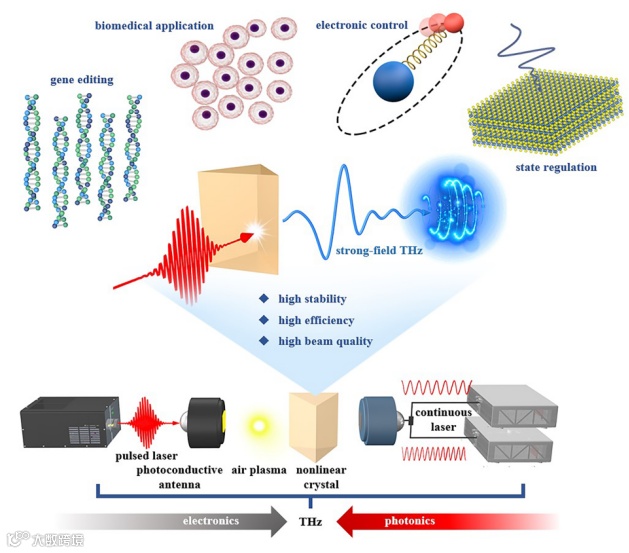 随着THz源的发展和THz场强不断提升,越来越多的科研工作者投身于强场THz与生物组织的相互作用。图8是强场THz和不同尺度的生物组织相互作用的总结概念图。