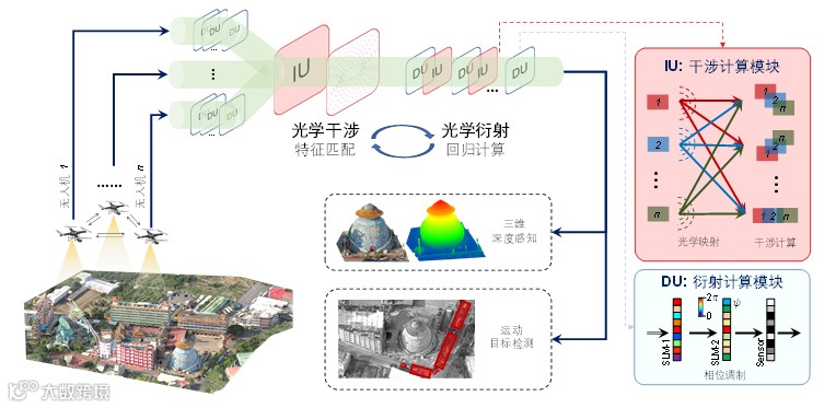 清华大学电子工程系方璐课题组,提出了多通道光电智能计算新架构Monet(Multichannel Optical neural NETwork architecture,如图1所示)。其中,编码投影干涉计算单元IU,通过相位和偏振的编码调制以及通道间的光学干涉,实现了特征匹配、加权求和等多通道光学基本计算。提出了干涉计算单元IU和衍射计算单元DU交替级联的光电网络模型,实现了光场信息的多通道高效处理,突破了现有光电神经网络结构简单、通道受限等瓶颈,为构建大规模光电神经网络实现复杂光场智能感算提供支撑。