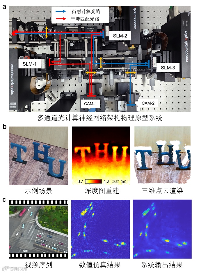 进一步,团队利用空间光调制器(SLM)等器件搭建了Monet原型物理系统(如图3a所示),并利用其实现了双目深度感知(图3b)与运动物体检测(图3c),验证了本文所提出的多通道光电神经网络的任务普适性与规模扩展性。