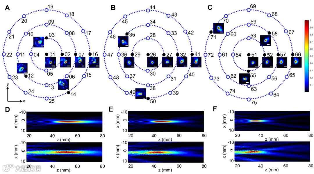 图5 用于三维空间中焦点操纵的超构器件性能的实验验证。 (A-C) 当焦距设置为 (A) 60 毫米、(B) 50 毫米和 (C) 40 毫米时,x-y 平面中焦点调制范围和强度分布测量结果。所有点都是根据理论分析进行数值计算,并选取实心点在实验中进行验证。比例尺为 5 毫米。 (D-F) 当焦距设置为 (D) 60 毫米、(E) 50 毫米和 (F) 40 毫米时,x-z 平面中的实验上(顶部)和理论上(底部)的强度分布。入射方向朝向正 z 轴。