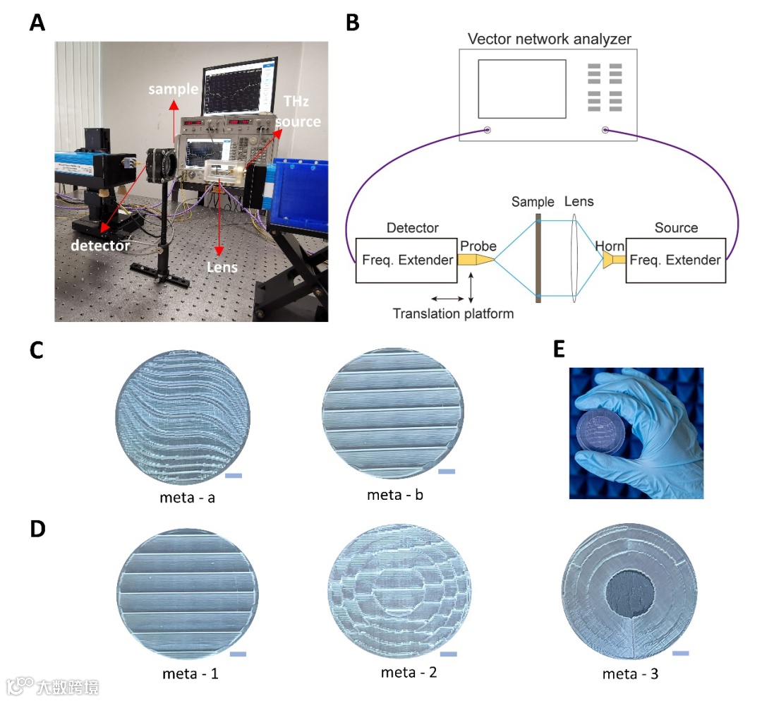 本工作实验验证了一种可调焦点范围为整个平面或完整三维空间的可变焦太赫兹超构器件的新设计。研究团队通过在多个超构表面上合理地分布若干相位分布,即立方相位、梯度相位和聚焦相位,并通过超构表面的旋转来实现对入射波束的不同调制。作为概念验证,本工作展示了两种超构器件,以验证操纵波前和任意聚焦的能力。双片超构表面组成的超构器件用于控制在二维平面上聚焦的艾里光束;三片超构表面组成的超构器件是为三维空间中的焦点操纵而开发的。这两个超构器件的示意图如图 1 所示。他们能够使焦点在不同的检测器之间快速切换,为未来的6G通信系统提供了高灵活性、高方向性和高信号集中性能。除了焦点的任意操纵之外,艾里光束的无衍射、自愈、自加速特性可以提高无线通信中信号传输的稳定性和安全性。简而言之,无衍射特性意味着信号可以在更长的距离内持续传输。自我修复功能有助于在中断后快速恢复信号;自加速性能使信号能够避免窃听行为发生。这些突破将有助于 6G 通信技术的发展,使其更加稳健可靠。图2是超构天线和超构器件相位分布的设计。图3是实验装置和3D打印加工得到的样品。图4和图5分别是所设计的两种超构器件的实验验证。